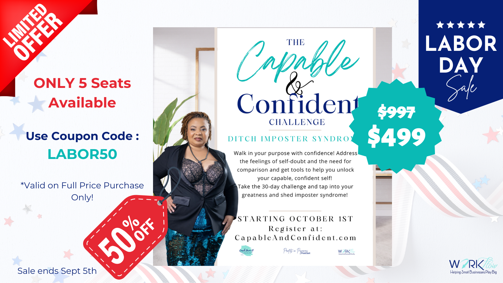 During the Capable and Confident Challenge, you learn how to identify your triggers for imposter syndrome and self-doubt, and how to create a new narrative of confidence. The key is to get the root of your feelings and then create counter mechanisms to redirect your thoughts to ones that tap into your confidence! What you'll get: 30-Day Challenge Daily Video Exercises (15 minutes or less) Access to Private Facebook Community Weekly Group Coaching Calls! ...and most importantly, you will be able to walk confidently in your purpose!